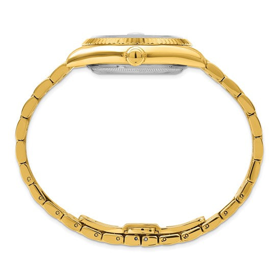All gold wrist watch with a bold, sapphire blue face, classic fluted bezel with crystal hour indicators and calendar day date.