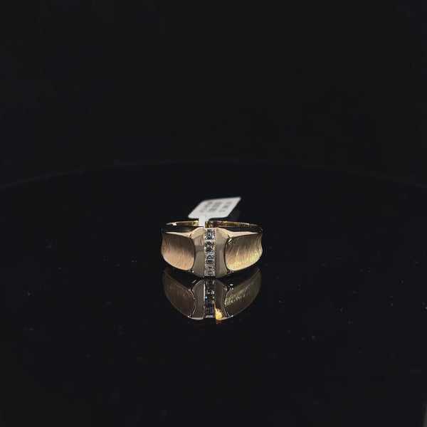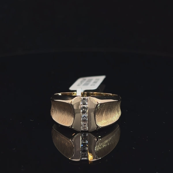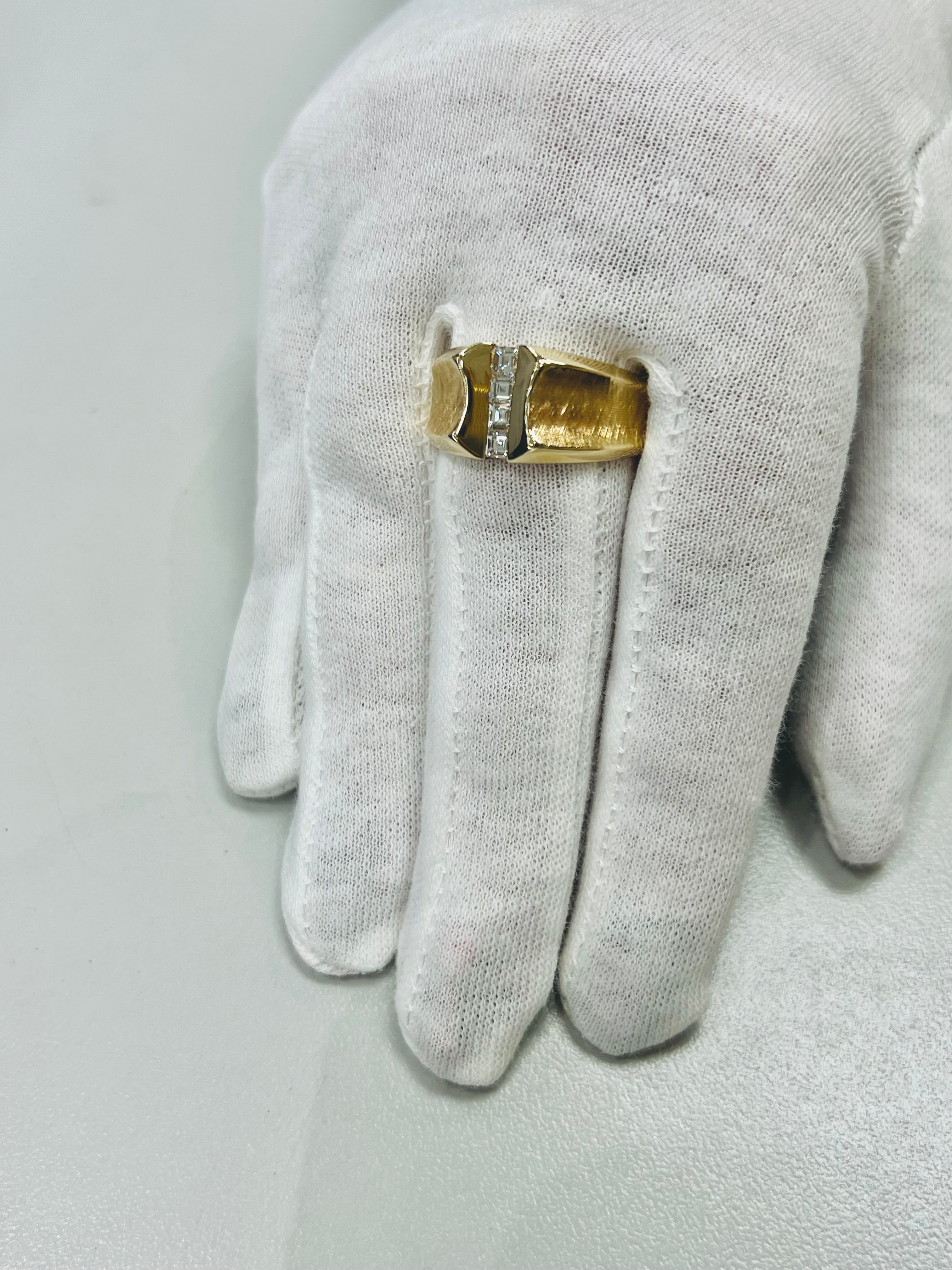 - A solid design with a hatching brush finished and a high polished finish, set with 4 step-cut square diamonds centered vertically in a low-profile channel. Giving this vintage 70s ring a revived art deco look from the 1920s.